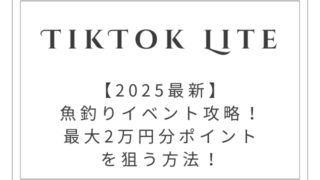 TikTok Lite 【2025最新】TikTokライト魚釣りイベント攻略ガイド!最大2万円分ポイントを狙う方法! TikTokライトで開催中の「魚釣りイベント」を徹底解説!参加方法・開催期間・ポイント獲得のコツをわかりやすく紹介。最大2万円分のポイントを稼ぐ攻略法も紹介! 2025.10.13 TikTok Lite生活お役立ち情報・ポイ活